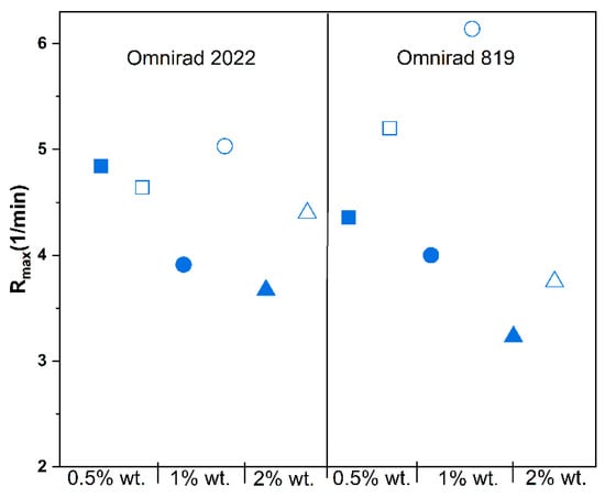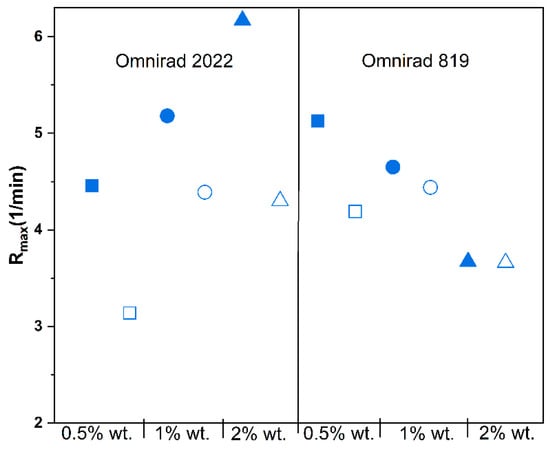 Considering Figure 3a, Figures S2a and S3a (systems with Omnirad 2022), it can be noticed that a higher concentration of photoinitiator leads to higher reaction rates. This might be assumed as a result of the higher number of formed radicals. On the other hand, compositions containing Omnirad 819, as shown in Figure 3b, Figures S2b and S3b, exhibit only slight differences between the 0.5% and 1% concentrations. Furthermore, unusual phenomena were observed for a higher concentration of photoinitiator Omnirad 819, which leads to significantly lower Rmax.
