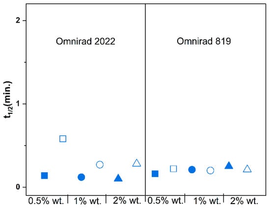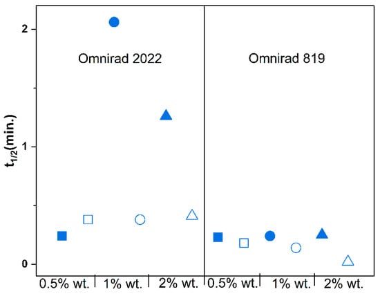 Oxygen inhibition influences the t1/2 (Figure S3 in Supplementary Material) but mainly influences systems cured with Omnirad 2022. Moreover, the increase in the photoinitiator concentration minimizes the effect of oxygen inhibition, which is related to the generation of more radicals. In summary, the systems cured with Omnirad 2022 are more susceptible to oxygen inhibition when cured with a light intensity of 20 mW/cm2 than those cured with Omnirad 819.