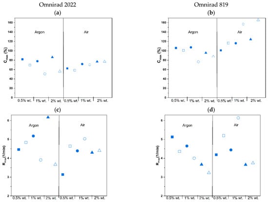 Effect of intensity of light on the maximum conversion (Cmax) (a) for Omnirad 2022 and (b) for Omnirad 819; maximum reaction rate (Rmax) (c) for Omnirad 2022 and (d) for Omnirad819. The reactions at 20 mW/cm2 (closed symbols) and 50 mW/cm2 (open symbols). Square—0.5% wt.; bullet—1% wt.; triangle—2% wt.