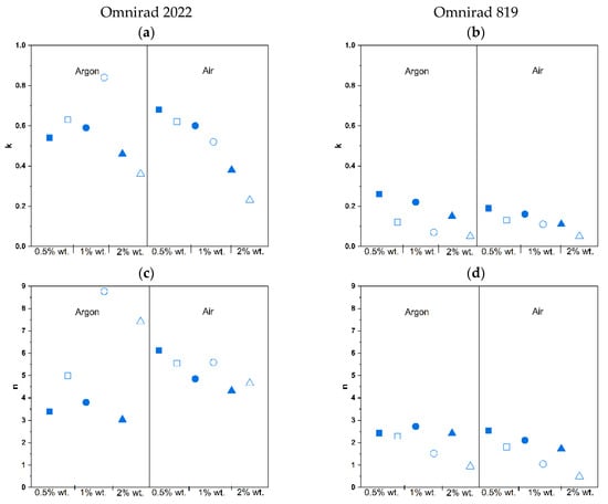 The kinetic parameters of photocrosslinking are presented in Table 2. The rate constant, k, is related to the reactivity of the system, the type and concentration of the initiator, the reaction atmosphere, light intensity, and temperature. At a constant temperature and in the same type of reaction atmosphere, a comparison of the k values provides information about the relative reactivity of the photoinitiator. Significantly higher values (from 0.68 to 0.38) were obtained for Omnirad 2022 compared to Omnirad 819 (from 0.26 to 0.11). Surprisingly, an increase in photoinitiator concentration leads to a lower k. This can be explained by the higher reactivity of the blend (Omnirad 2022) than the Omnirad 819 single component. The effect of the atmosphere on the reaction rate constant is negligible.