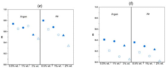 Moreover, in Figure 8, Figure 9 and Figure 10, significant differences between the types of curing atmosphere are noticeable. The highest maximum reaction rates of 6.17 min−1 were achieved for the sample containing 2% wt. of Omnirad 2022 cured in argon, in comparison with a value of 4.36 min−1 for the same sample cured in air. The major influence of oxygen inhibition is observed for systems with Omnirad 2022; the difference is smaller for systems with Omnirad 819, especially with the increased concentration of photoinitiator (Figure S3 in Supplementary Material). Therefore, it might be concluded that both or one of the other chemical compounds (TPO-L or/and Omnirad 1173) from the Omnirad 2022 blend (see structure in Figure 5) are/is more sensitive to oxygen molecules.