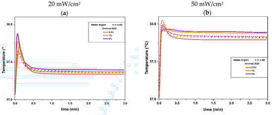 The maximum temperatures of investigated systems are presented in Figure 16 and Tables S2 and S4 in Supplementary Material. It can be noticed from Figure 16 that when samples were cured at 20 mW/cm2, the temperature increased slightly (maximum from 37 °C to 38.1 °C). A much higher difference is visible for systems cured at higher light intensity. First of all, the shape of the plots is different. When samples are cured at 20 mW/cm2, the visible peak can be observed in the early stage (like the time-dependent reaction rate plot). After around 0.5 min, the temperature decreases to ~37.4 °C. On the contrary, for systems cured with higher light intensity, the peaks appear faintly. The maximum temperatures are slightly higher (~38.1 °C) and remain almost constant at ~37.9 °C). Thus, it can be concluded that an irradiance of 20 mW/cm2 is safe and does not exceed 37.5 °C independently from photoinitiator concentration, which is important if such materials will be suggested for medical applications.