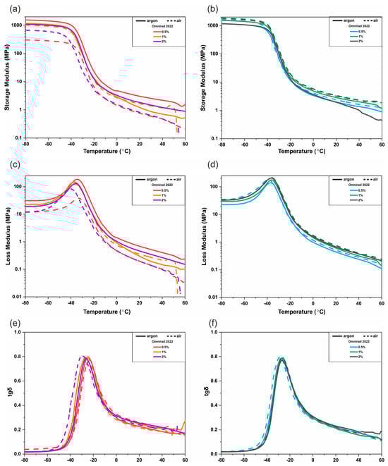 DMTA analysis of photocured polymer networks with the use of 50 mW/cm2 light intensity: (a,b) the storage modulus (E′), (c,d) loss modulus (E″), and (e,f) the tangent of the phase angle (tan δ).