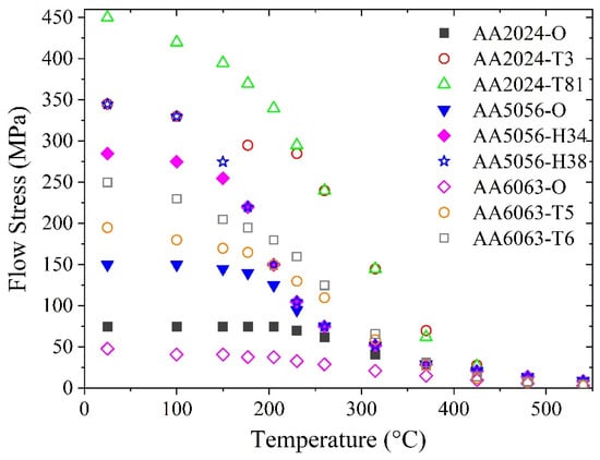 Figure 1 shows the flow stress of nine typical commercial aluminum alloys, which is taken from a handbook for aluminum alloys []. It could be found from Figure 1 that, the flow stress of the aluminum alloys decreases nonlinearly with rising temperature. It is found that the flow stress temperature curves could be divided into three sections, which are (i) low-temperature section, where the temperature is from room temperature to ~150 °C, (ii) medium-temperature section, where the temperature is from ~150 °C to ~400 °C and (iii) high-temperature section, where the temperature is above ~400 °C. In the low-temperature section, the reduction of flow stress with a rising temperature occurs at a relatively slow rate, because the strengthening components such as dislocations and precipitates, do not significantly change at low temperatures. In the medium-temperature section, the flow stress reduces rapidly due to the precipitates coarsening/dissolution and the reduction in the dislocation density induced by recovery or recrystallization caused by the elevated temperature. In the high-temperature section, the flow stress is approaching zero at a relatively slow rate with temperature rising when the temperature is getting close to the solidus temperature.