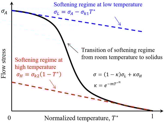 As the flow stress of aluminum alloys decreases nonlinearly with rising temperature, we need to develop an analytical equation that is able to describe the underlying physics. As mentioned above, the decreasing rate of flow stress versus temperature is different in the low-temperature section, medium-temperature section, and high-temperature section. Therefore, we use a linear term to describe the slow decreasing rate in the low-temperature section and high-temperature section, while the rapid decrease in medium medium-temperature section is taken as a nonlinear transition between the low-temperature section and high-temperature section. Figure 2 illustrates the concept in considering the nonlinear thermal softening behaviors in the proposed model. As shown in the figure, we utilize two linear terms to represent the reduction of flow stress versus temperature in the low-temperature section and the high-temperature section. The new thermal softening model is proposed by combining the two linear terms, which is given as,