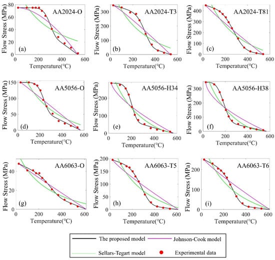 Comparison of the accuracy between the proposed model, Johnson–Cook model, and Sellars–Tegart model fornine types of commercial aluminum alloys, which are (a) AA2024-O, (b) AA2024-T3, (c) AA2024-T81, (d) AA5056-O, (e) AA5056-H34, (f) AA5056-H38, (g) AA6063-O, (h) AA6063-T5 and (i) AA6063-T6.