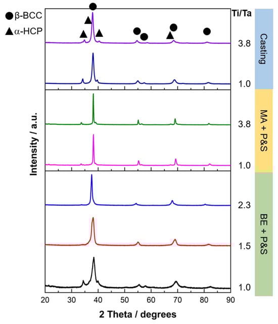 The lower Ti/Ta ratio promoted higher elastic modulus values. The elastic modulus in the BE + P&S samples increased 9.9% when increasing the Ti/Ta ratio from 1.0 to 2.3. An increment of 19.6% in the elastic modulus was observed when decreasing the Ti/Ta ratio from 3.8 to 1.0 in the MA + P&S samples. Samples produced by casting also showed an increment of 9.7% in the elastic modulus when decreasing the Ti/Ta ratio from 3.8 to 1.0. This implies that Ti/Ta ratio does not restrict the bonding strength, which is the main factor influencing the elastic modulus. Wolverton [] has reported a direct correlation between the atomic radius of alloying elements and the bonding energy in Al alloys. Therefore, the main effect of lowering the Ti/Ta ratio, i.e., increasing high-density Ta (Table 1), was increasing the density of the alloys with a probable restriction of atomic diffusion during their processing. This is in good agreement with the highest porosity of the samples with the lowest Ti/Ta ratio (Figure 3).