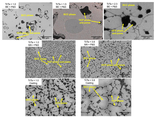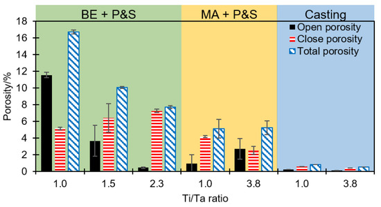- The processing methods were influenced by the high-density Ta contents (lowering the Ti/Ta ratio) and produced total porosity in the following order: casting (0.5–0.8%) < MA + P&S (5.1–5.2%) < BE + P&S (7.7–16.7%).