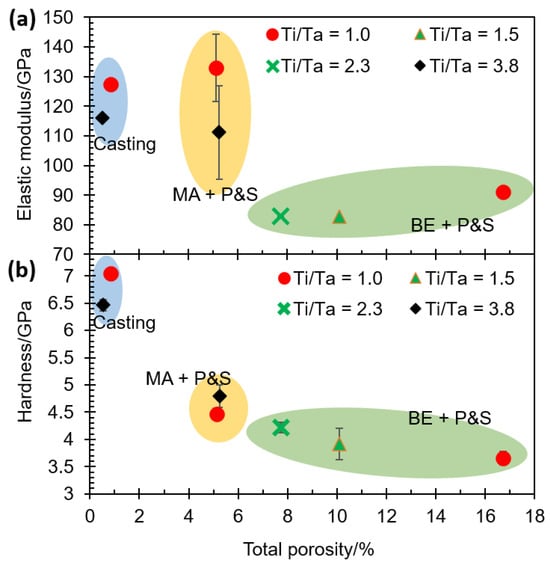 The abovementioned effect of atomic diffusion on bonding formation is expected to influence the elastic modulus. Figure 4a shows the elastic modulus as a function of the total porosity of alloys. It can be seen that the lower porosity generated a higher elastic modulus, i.e., the elastic modulus followed an inverse relationship with the total porosity. BE + P&S samples showed the lowest Young’s moduli values (82.7 to 91.0 GPa), followed by the MA + P&S (111.2 to 133.0 GPa), and then cast samples (115.9 to 127.3 GPa).