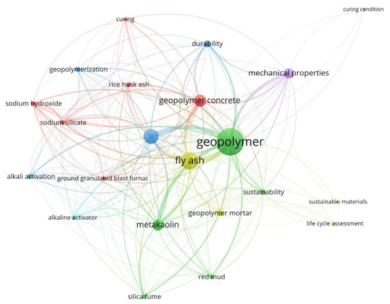 Figure 2 presents the results of the bibliometric network visualization, which offers a visual representation of the research focuses and interconnections within the field of geopolymers. In this visualization, each item is depicted by its label and typically represented by a circle. The size of both the circle and the label was decided by the weight assigned to the respective item. The network visualization was generated using the VOS viewer version 1.6.19, a specialized software for analyzing document measurement networks [45]. It was applied to analyze the terminology used in the titles of research articles related to geopolymers indexed by the Scopus database.