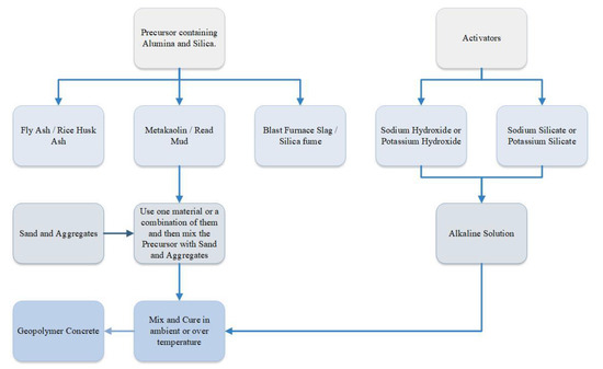 Geopolymers are inorganic polymer materials created through the combination of various aluminosilicate source materials with alkali-activator solutions [51]. Geopolymer cement concrete (GPCC) is a form of concrete produced with GP binder rather than ordinary Portland cement (OPC) [34]. The main components of GPC are source materials, alkaline activators mixed with fine or coarse aggregates, and water [52]. The aluminosilicate source materials may occur naturally, like metakaolin (MK), kaolin, bagasse ash, volcanic rock powder, and rice husk ash (RHA), or they might be produced industrially, like blast furnace slag (BFS), fly ash (FA), and silica fume (SF) [53]. The primary alkaline activators (AAs) are sodium hydroxide (NaOH) and sodium silicate (Na2SiO3); nevertheless, any silicate or hydroxide can be employed as an activator, including potassium silicate (K2SiO3) and potassium hydroxide (KOH) [52,54]. GPCC might be one-part or two-part based on the activator source addition process. The one-part GPC, commonly referred to as “Just Add Water,” requires solely a dry mix along with water. This dry mix is made by combining a solid alkali activator accompanied by a solid aluminosilicate precursor, with the option of including or excluding the calcination process [55]. Additionally, in the two-part GPCC, also known as conventional GPCC, the activators are introduced as a liquid state along with the water into a solid aluminosilicate precursor [54]. Figure 3 shows the flowchart for the process of creating a geopolymer concrete (GPC).