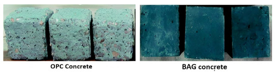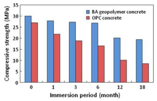 Durability refers to the material’s ability to withstand different environmental conditions, various forms of chemical attack (such as carbonation, sulfate, chloride, and acid attacks), physical attacks (including freeze-thaw cycles and elevated temperatures), mechanical attacks (like abrasion, erosion, and cavitation), as well as potential construction-related issues (such as inadequate consolidation and curing). This quality ensures that the material maintains its performance throughout its service life [104]. In a study performed by Pasupathy et al. [152], a comprehensive examination was undertaken to assess the carbonation resistance of geopolymeric concrete derived from a combination of slag and fly ash over an eight-year period of exposure to the environment. The findings showed that the carbonation rate of GPC was remarkably affected by the specific mix design of its materials. Notably, the mixture categorized as Type 1 GPC, consisting of 75% FA, 25% GBFS, and an extra Na2SiO3 activator, exhibited lower carbonation resistance in comparison to OPC concrete. On the other hand, Type 2 geopolymer, comprising 70% FA, 30% GBFS, and lacking the additional Na2SiO3 activator, displayed a carbonation resistance similar to that of OPC concrete. In another study, Elyamany et al. [153] performed a study to analyze the factors affecting the resistance of geopolymer mortar to magnesium sulfate MgSO4 where various geopolymer mortars were compared with OPC mortar by immersing them for up to 48 weeks in a solution with 10% magnesium sulfate. The findings revealed that higher cure temperatures, greater molarity of sodium hydroxide solution, and a decrease in the proportion of alkaline solution to binder improved the geopolymer mortar’s resistance to magnesium sulfate MgSO4. As a result, geopolymer mortars demonstrated improved durability in MgSO4 solution in comparison to OPC mortars. Yang et al. [154] examined the effects of exposing FA geopolymer pastes to a 3% NaCl solution for 72 h. The findings were positive, particularly when slag was added to the FA-based geopolymer. This inclusion of slag served to fill the pores within the material, reducing its vulnerability to the entry of chloride ions. Moreover, the study conducted by Sun and Wu [155] illustrated that F-type fly ash, characterized by its low calcium content, exhibited good resistance to freeze-thaw cycles when compared to Portland cement. Furthermore, Bakharev [156] examined the durability of geopolymer materials created using alkaline-activated FA and subjected them to 5% solutions of acetic and sulfuric acids. The geopolymer materials demonstrated notably better performance in comparison to OPC pastes. Moreover, Marvila et al. [157] investigated the behavior of MK-based geopolymers activated using sodium hydroxide and silicate when subjected to elevated temperature environments. It was confirmed that the mechanical characteristics of the materials in question remained intact even after exposure to temperatures as high as 1050 ºC. Ariffin and colleagues [158] conducted a long-term study in which geopolymer concrete (GPC), composed of a mixture of pulverized fuel ash and palm oil fuel ash, was subjected to a 2% sulfuric acid solution for a duration of 18 months. Observational assessments revealed that the blended ash geopolymer (BAG) concrete samples exhibited no notable alteration in their external appearance, whereas ordinary Portland cement (OPC) concrete samples displayed pronounced degradation, as illustrated in Figure 5. The BAG samples experienced an 8% loss in weight, which was considerably less than the 20% weight reduction seen in the OPC concrete samples. Regarding structural integrity, BAG concrete showed a decrease in strength by 35% over the 18-month period, whereas OPC concrete suffered a 68% reduction in strength within just 30 days, with further significant deterioration noted at the 18-month point, as depicted in Figure 6.