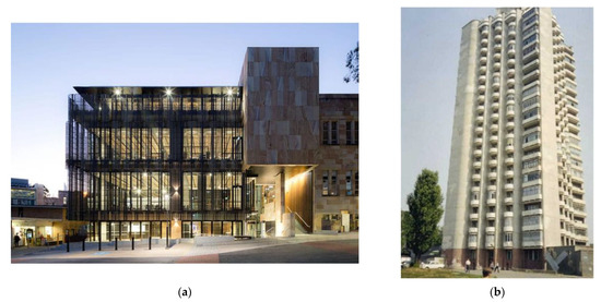 (a) The University of Queensland’s Global Change Institute [166]; (b) building constructed in 1994 with AAS concrete, completed in Lipetsk, Russia [162].