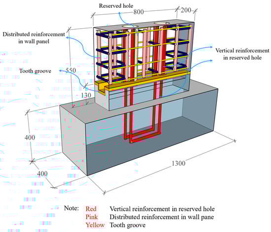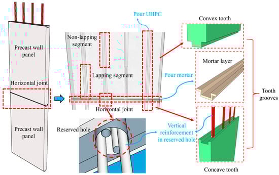 In order to solve the problems of high construction accuracy, the need for on-site formwork, uncompacted grouting, and difficulty in positioning and assembling existing horizontal joint connection methods, our research group proposed an innovative tooth groove connection and vertical reinforcement lapping in the reserved hole [30]. The connection details are shown in Figure 1.