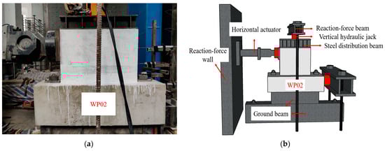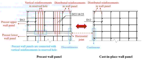 As shown in Figure 4, compared with the cast-in-place wall panels, the distributed reinforcements in the precast wall panels are discontinuous at the joint and are only connected by the vertical reinforcements in reserved holes. Therefore, the degree of vertical reinforcement connection is defined as the ratio of the cross-sectional area of the vertical reinforcements in the reserved hole to the cross-sectional area of the distributed reinforcements. For instance, in the case of WP01, the vertical reinforcements in the reserved hole are configured at 4D22 (1520 mm2), while the distributed reinforcements in the cast-in-place wall panel are set at 12D12 (1357 mm2), resulting in a reinforcement connection degree of approximately 100%, where “D” represents the symbol for steel reinforcement. The reinforcement ratio to the cross-section of precast concrete wall panel is 0.85% by calculation, which meets the requirements of the current standard [33]. The key parameters of the experimental design are shown in Table 1.