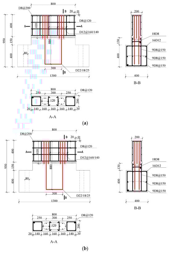 The precast wall panel specimens consisted of precast wall panels, precast basement, a mortar layer, and UHPC. The distributed reinforcements in the wall panel were arranged in a double-layer pattern and interconnected using tied reinforcements to form a unified entity. At the horizontal joint, the distributed reinforcement in the wall panel was discontinuous and not connected to the basement. In the basement, two U-shaped reinforcements were pre-embedded at the corresponding positions of the reserved hole, extending 400 mm above the concave tooth groove surface of the basement. These U-shaped reinforcements were of the same specifications as the vertical reinforcement inserted into the reserved hole of the precast wall panel, and they indirectly lapped together in the reserved hole. The distributed reinforcement in the wall panel has a diameter of 12 mm. Meanwhile, the vertical reinforcement in the reserved hole has diameters of 18 mm, 22 mm, and 25 mm, respectively. UHPC was poured in the reserved hole to realize the effective connection of the vertical reinforcement in the reserved hole. The reinforcement details of the wall panel specimens are shown in Figure 5. Due to the use of UHPC in the reserved hole grouting material, the lap length of vertical reinforcement in the reserved hole could be reduced to 12.6d [32]. For convenience of construction, a lap length of 400 mm was used.