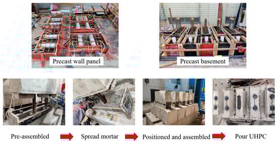 The precast basement and wall panel were poured separately. The full-length reserved holes of the wall panel were made of PVC pipe, and the U-shaped vertical reinforcements were pre-embedded in the basement. During the assembly process of the wall panel specimens, the “calibrate first, then level” principle was followed. First, the basement was positioned and leveled, and mortar was spread in the tooth groove. Then, the wall panel was positioned and assembled, ensuring that the pre-embedded reinforcements were inserted into their corresponding reserved holes. The vertical reinforcement was then inserted, evenly distributed in the reserved holes. Finally, UHPC was poured into the reserved holes to achieve effective bonding of the vertical reinforcement. After curing with water for 28 days, the specimens were prepared for a monotonic horizontal load test. The assembly process of the specimens is shown in Figure 6.