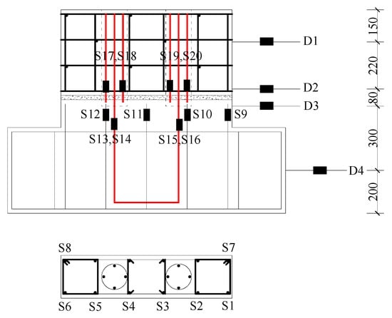 As shown in Figure 8, on one side of the specimen, there were a total of four displacement sensors arranged as follows: D1 measured the horizontal displacement of the wall panel at the same height as the horizontal actuator. D2 and D3 measured the relative displacement of the wall panel on both sides of the horizontal joint, indicating the lateral displacement in the joint. D4 measured the sliding displacement in the basement. It can be seen from Figure 8 that a total of 20 steel strain measuring points were arranged in the specimen, of which S1–S12 were the distributed reinforcement steel strain gauges and S13–S20 were vertical reinforcement steel strain gauges, which were distributed at both ends of the lap section.