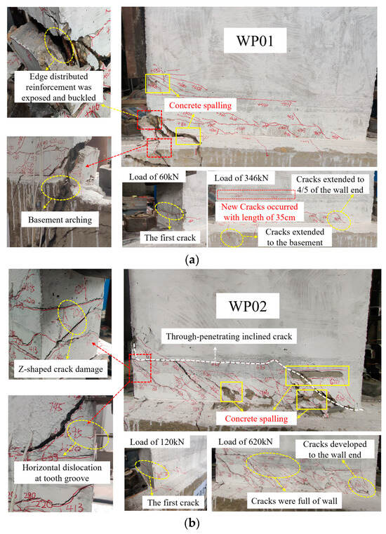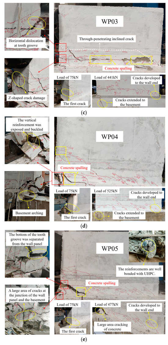 During the crack initiation and development stages, each specimen initially exhibited an elastic state with minimal residual deformation. Horizontal cracks first appeared at the bottom of the tooth groove, closer to the horizontal actuator side, and gradually extended to the surface of the wall panel. During the yield stage, the deflection of all the specimens increased nonlinearly. Horizontal cracks at the bottom of the tooth groove developed diagonally away from the horizontal actuator side, accompanied by 45-degree inclined cracks extending to the basement. During the peak stage, the cracks at the bottom of the tooth groove and at the junction of the wall panel and the basement near the horizontal actuator side widened significantly, and concrete exhibited tensile failure and spalling, while concrete on the side further from the horizontal actuator underwent compression failure. During the ultimate stage, both the upper and lower surfaces of the tooth groove exhibited prominent cracking, edge-distributed reinforcements became exposed and buckled, and the central portion of the basement exhibited conspicuous arching. However, it was noteworthy that specimens WP02 and WP03 exhibited more extensive crack development during the ultimate stage, including through-penetrating inclined cracks and horizontal dislocation at the tooth groove, with a displacement of approximately 2 mm. The failure modes of the specimen are shown in Figure 9.