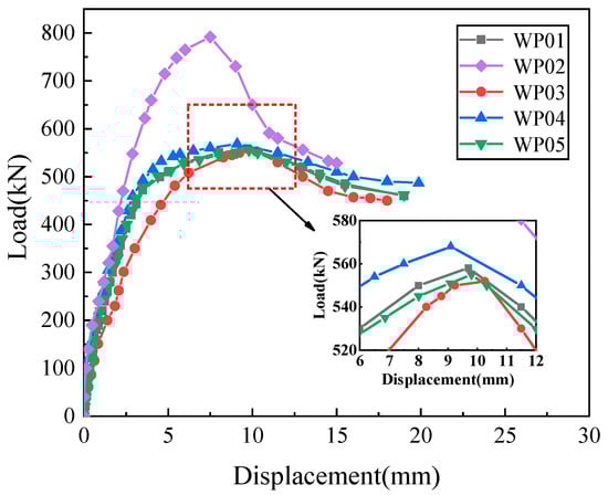 To investigate the influence of axial compression ratio on the joint connection performance of precast wall panel with tooth groove connection and vertical reinforcement lapping in reserved holes, the finite element model of the WP02 specimen with a vertical reinforcement connection degree of 100% and reserved circular holes was taken as an example to compare and analyze the variation law of joint connection performance of precast wall panel specimens with axial compression ratios of 0.1, 0.2, and 0.3. Based on the finite element analysis results, the load–displacement curves of the specimens under different axial compression ratios are plotted, as shown in Figure 16.