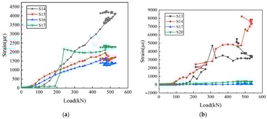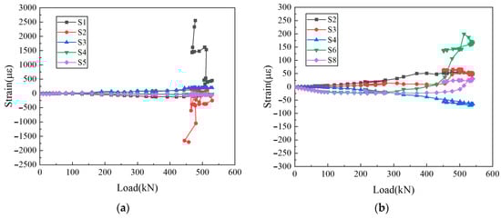 The strain–load curves for the distributed reinforcement of the wall panel and the vertical reinforcement in the reserved hole are depicted in Figure 11 and Figure 12.