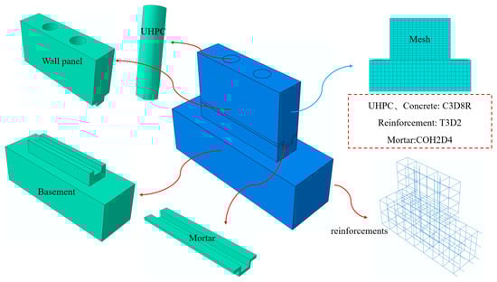 To further investigate the joint connection performance of the new precast wall panels, finite element analysis was conducted using the software ABAQUS 6.14. The finite element modeling process is illustrated in Figure 13. Concrete and UHPC materials were simulated using the concrete plastic damage model in ABAQUS [40], which calculated the tensile–compressive stress–strain relationship and the tensile–compressive damage–strain relationship of concrete based on standard [41]. The material properties of the reinforcements were modeled using a bilinear model, including both the elastic and strengthening stages. Based on material testing, the average values for the yield strength and ultimate strength of the reinforcements were 450 N/mm2 and 630 N/mm2. For the strengthening stage, a modulus of elasticity of 0.01Es was used, where Es is the elastic modulus. In the model, the concrete and the UHPC in the lapping segment were all represented using solid elements (C3D8R), while the reinforcements were modeled using truss elements (T3D2), and the mortar layer adopted the cohesion element (COH2D4). The distributed reinforcements were embedded in the concrete, and since the vertical reinforcements in the reserved hole bonding with UHPC were well-anchored during the experiments, they were also embedded in the UHPC. The contact between the reserved hole and the UHPC was modeled using tie constraints. This finite element analysis allows for further investigation of the joint connection performance of the precast wall panels under a monotonic horizontal load.