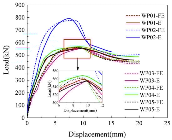 The finite element model established above was used to simulate the crack development and failure behavior of the specimens under a monotonic horizontal load in the tests. And the finite element analysis results and the experimental results of the load–displacement curve are shown in Figure 14, where FE represents finite element analysis results and E represents experimental results.