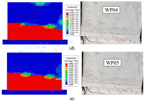 Failure modes comparison of finite element analysis results and the experimental results: (a) WP01; (b) WP02; (c) WP03; (d) WP04; (e) WP05.