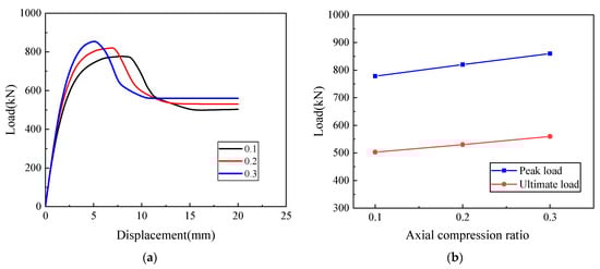 The influence of axial compression ratio: (a) Load–displacement curve; (b) Peak load and ultimate load curves with axial compression ratio.