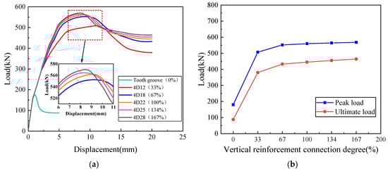The influence of vertical reinforcement connection degree: (a) Load–displacement curve; (b) Peak load and ultimate load curves with vertical reinforcement connection degree.