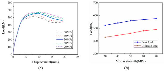 The influence of mortar strength: (a) Load–displacement curve; (b) Peak load and ultimate load curves with mortar strength.