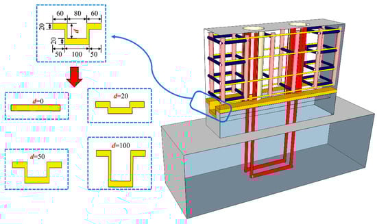 The local detail diagrams of different tooth groove depths are shown in Figure 19 (d represents the tooth groove depth in Figure 19). The total width of the tooth groove is the same as the wall thickness, which is 200 mm. Based on the parameters of WP01, the peak bearing capacity of model specimens with four different tooth groove depths (0 mm, 20 mm, 50 mm, and 100 mm) was studied. The simulation results are illustrated in Figure 20.
