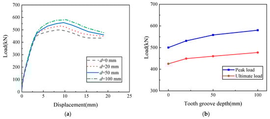 The influence of tooth groove depth: (a) Load–displacement curve; (b) Peak load and ultimate load curves with tooth groove depth.