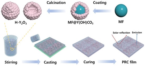 Schematic diagram of the Y2O3 hollow particle fabrication process used for passive radiation cooling and the PRC film manufacturing process using hollow particles.