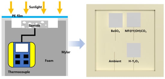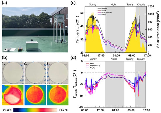 Field tests were conducted to confirm the actual cooling performance. Figure 7a shows the experimental device used for the measurements. In Figure 7b, an IR camera image captured at 14:00 on 21 July 2023 shows the external temperature of the sample. BaSO4 exhibited the highest external temperature at 26.8 °C, followed by MF@Y(OH)CO3 and H-Y2O3, which showed lower temperatures. Figure 7c displays the sample temperature and solar irradiance, while Figure 7d presents a graph showing the temperature difference between the ambient temperature and the sample temperature. Lower values indicate cooler sample temperatures. The insolation and temperature trends of the measured PRC films were similar, and no interference other than sunlight was observed. The gray area represents periods of low insolation during nighttime and cloudy weather. During the daytime, the MF@Y(OH)CO3 sample exhibited the lowest temperature, followed by BaSO4 and H-Y2O3. This is because the PRC is significantly influenced by solar reflectance during the daytime. The core material of MF@Y(OH)CO3, MF, has a thermal conductivity of 0.03 W/m∙K, reducing heat conduction from the surroundings and making it less affected by external temperatures. As a result, the PRC film with MF@Y(OH)CO3 was measured to have a lower temperature than H-Y2O3. The nighttime trend differed from the daytime trend. BaSO4 and H-Y2O3 cooled to −3 °C with a slight difference, while the temperature decrease of MF@Y(OH)CO3 was less significant. This showed a similar trend to the atmospheric window emissivity measured using FDTD simulation and FT-IR, and nighttime passive radiative cooling was found to be proportional to the atmospheric window emissivity.