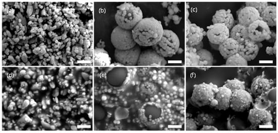 (a–c) SEM images of the PRC particles and (d–f) cross-sectional SEM images of the PRC films: (a,d) BaSO4, (b,e) MF@Y(OH)CO3, and (c,f) H-Y2O3. The scale bar is 1 μm.