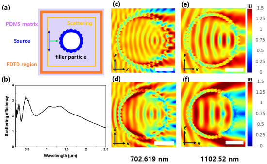 FDTD simulations were conducted to confirm the optical properties of the PRC particles. In Figure 5a, the FDTD simulation settings for the particles are depicted. We used PDMS as the matrix for the PRC films, established the FDTD simulation and scattering intervals, and placed the PRC filler particles in the center.