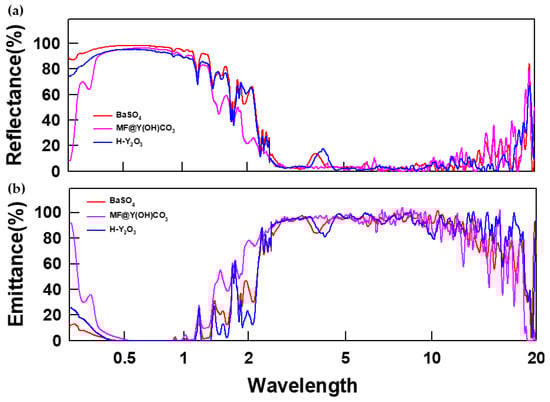 Figure 5b displays the particle scattering efficiency for each wavelength in the FDTD cross-section. The scattering efficiency wavelength range was set to 0–2500 nm. H-Y2O3 exhibited a higher total scattering efficiency in 0–2500 nm, indicating its expected higher solar reflectance compared to Y(OH)CO3.