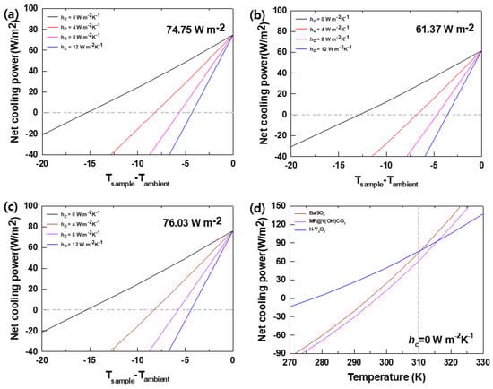 Calculation of the cooling power and theoretical cooling power of the PRC films at an ambient temperature of 310 K. Heat transfer coefficient (hc) values of 0, 4, 8, and 12 W·m−2·K−1 were used in the calculations: (a) BaSO4, (b) MF@Y(OH)CO3, and (c) H-Y2O3. (d) Calculation of the cooling power according to the temperature of the PRC film. Here, an (hc) value of 0 W·m−2·K−1 was applied.