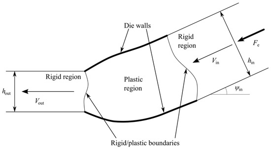 A sheet of initial thickness hin is extruded through a frictionless die. The final thickness of the sheet is hout. The process is stationary, and the deformation is plane strain. The elastic portion of the strain tensor is neglected. A plastic region in the die connects two rigid regions. One of the rigid regions moves horizontally with velocity Vout after exiting the plastic region. The other rigid region approaches the plastic region with velocity Vin at some angle ψin measured from the horizontal direction. A schematic diagram of the extrusion process is shown in Figure 1, where Fe is the extrusion force. The die shape that produces the above processes under the ideal flow condition should be found in the course of the solution.