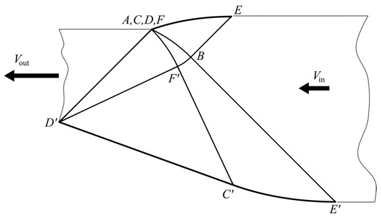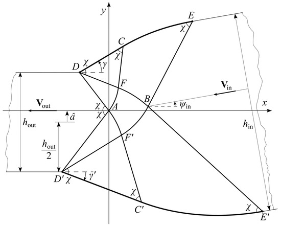 Some regions shown in Figure 3 degenerate to lines or points at certain values of the parameters classifying the characteristic network. One of the special solutions is obtained if γ’ = 0. In this case, angle AD’F’ vanishes, and line DAF’C’ becomes straight. This straight line is the rigid/plastic boundary, and triangle D’F’C’ becomes a part of the rigid sheet that exits the die. Since line AF’ degenerates to a point, region DAF’C’E’BF becomes a characteristic fan with a point singularity D. Thus, line DFBE’ becomes straight, and region DFBEC becomes a triangle, which can be treated as a part of the rigid sheet that enters the die. Therefore, line DFBE’ is the rigid/plastic boundary. Figure 5 illustrates the characteristic network. It is seen from (85) that this special solution corresponds to the maximum possible value of ψin at a given ratio hin/hout. This maximum value is readily determined from (86). It is clear from the above that the value of â is immaterial for this special solution.