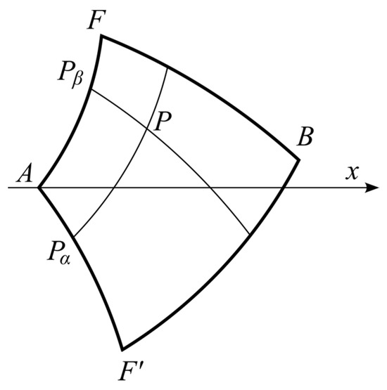 The characteristics of both families are curved in this region. Since ψ = 0 at point A, Equation (9) demands that the base α-line coincides with AF’ and the base β-line with AF (i.e., α = 0 on line AF, and β = 0 on line AF’). It follows from the geometry of Figure 3 that ψ = γ at point F and ψ = γ’ at point F’. Therefore, Equation (9) supplies the characteristic coordinates of points F’ and F in the form