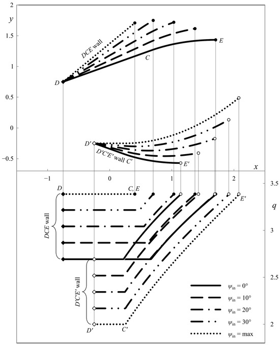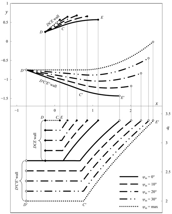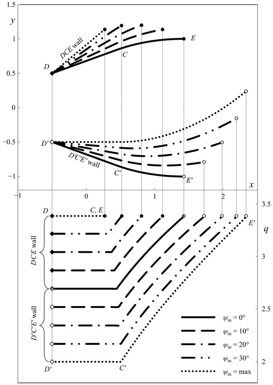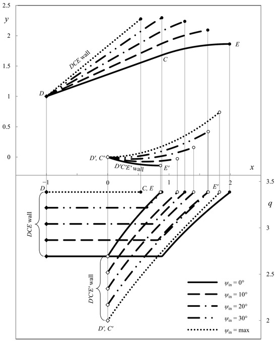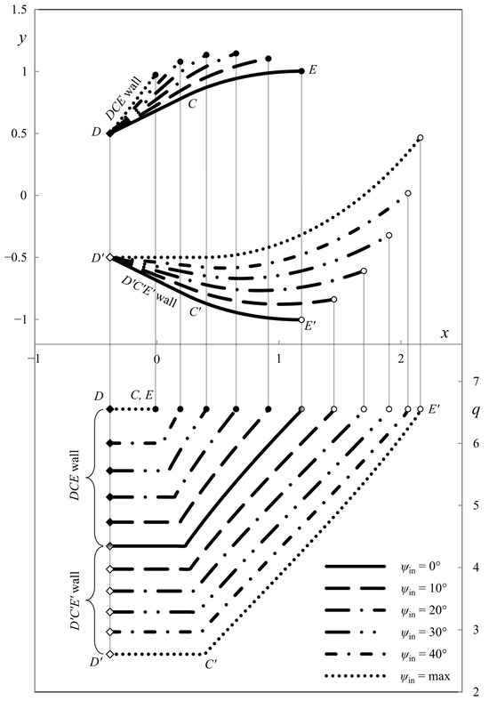 This section presents the numerical results demonstrating the process parameters’ effect on the ideal die shape and wall pressure. The deviation from the symmetric shape is emphasized. All the calculations have been performed for hin/hout = 2. Figure 7, Figure 8 and Figure 9 show several die profiles and the corresponding wall pressure distributions at â =0. The parameter ψin varies from 0 (symmetric dies) to its maximum value determined by Equation (86). Different figures correspond to different values of the angle of internal friction. In particular, φ = 0 in Figure 7 (pressure-independent material); φ = 15° in Figure 8; and φ = 30° in Figure 9.