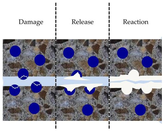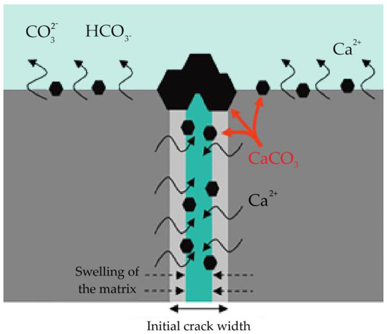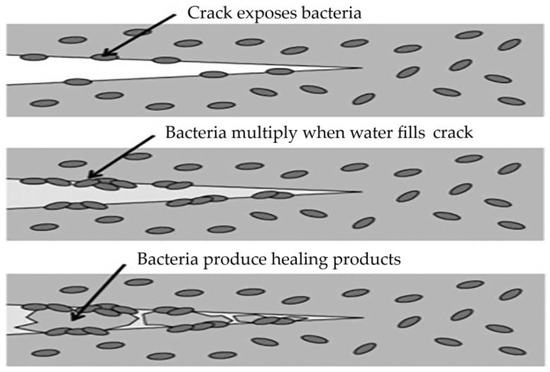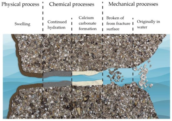 Autogenous healing is essentially a natural process induced by physical, chemical, and mechanical processes [30,31], as depicted in Figure 1.