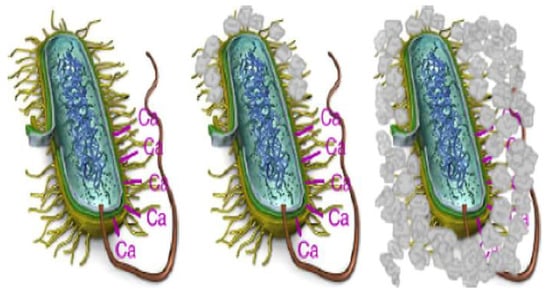 Certain bacteria added to concrete create urease, which catalyzes urea into carbonate and ammonium, which results in an increase in the pH value of the concrete and an increase in the concentration of carbonate in the bacterial environment. These components further hydrolyze into ammonium (NH4+) and carbonate ions CO32−, which leads to the formation of calcium carbonate. Figure 3 shows the deposition of calcium carbonate on the bacterial cell wall. The bacterial cell wall is negatively charged, and the bacteria draw cations from the environment, including Ca2+, to deposit on the surface of their cell. Ca2+ ions react with CO32− in preparation for the deposition of calcium carbonate on the cell surface, which serves as the site of nucleation.