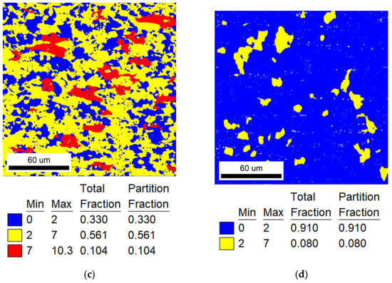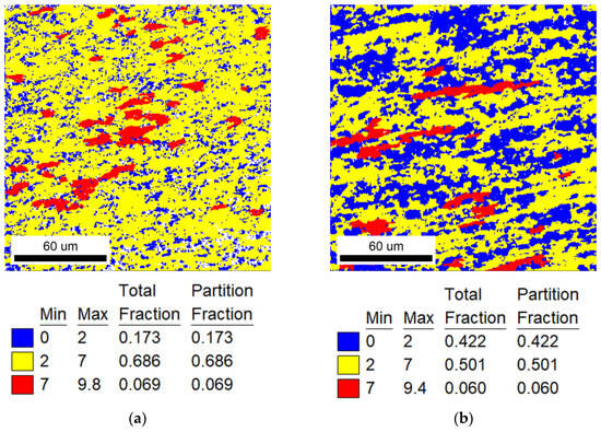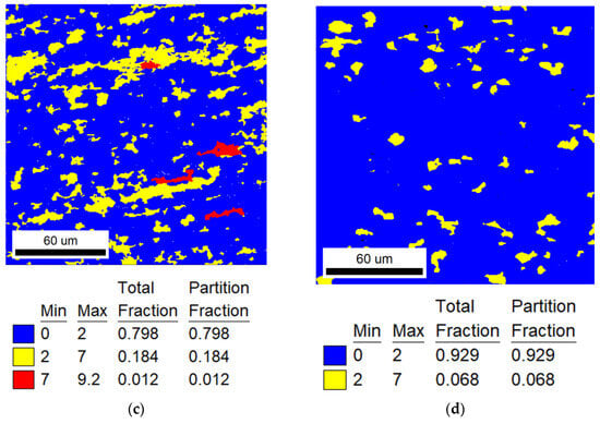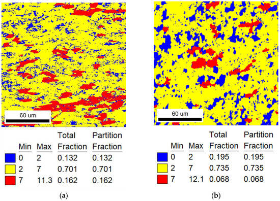 The specific recrystallization fraction statistics of different heat-treatment ranges are shown in Table 3. In addition, it can be found from Figure 2, Figure 3 and Figure 4 that the annealing temperature has a strong effect on the recrystallization behavior of TiNiFe alloys. And there is an important relationship between the recrystallization and the local deformation of grains.
