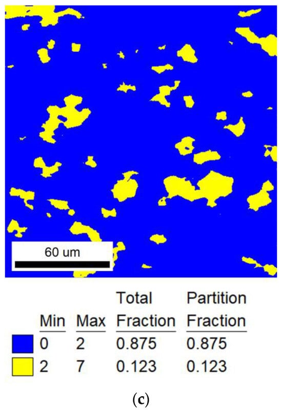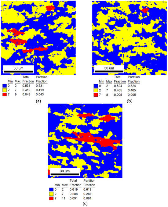 EBSD−GOS maps of experimental results of recrystallization fractions. The annealing treatments are calculated by Avrami model and Arrhenius equation: (a) range I for 823 K, and the annealing time calculation result was 776 min; (b) range II for 873 K, and the annealing time calculation result was 37 min; (c) range III for 923 K, and the annealing time calculation result was 12.5 min.