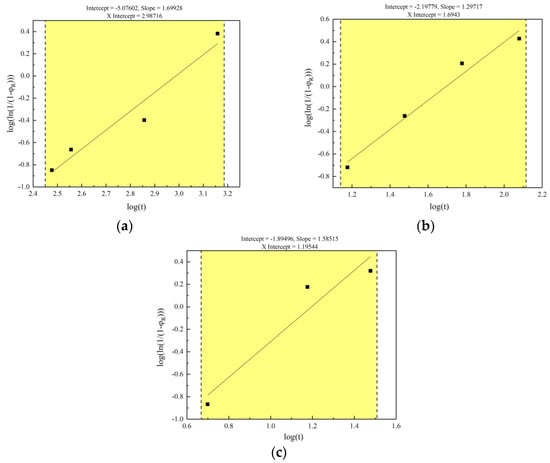 Linear fitting for Avrami models of range I (823 K), range II (873 K) and range III (923 K): (a) range I for annealed at 823 K; (b) range II for annealed at 873 K; (c) range III for annealed at 923 K.