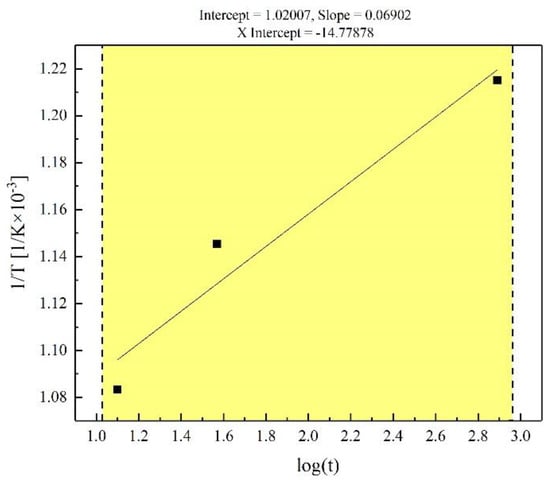 From the Avrami models above (Equations (8)–(10)), the time required when the recrystallization fraction φR = 50% at different temperatures can be calculated as shown in Table 5. And the annealing time t which is calculated from Equations (8)–(10) is brought into Equation (6) and the fitting result is shown in Figure 6. It can be seen from Figure 6 that the straight-line fitting results are highly matched with the previous calculation results.