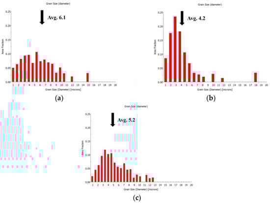 To verify the accuracy of the calculation results, samples of the calculated recrystallization fraction φR = 50% were heat treated according to Table 5. It can be found from the EBSD grain maps that, after the calculated annealing treatment, the grains were mainly fine equiaxed grains, accompanied by some elongated deformed grains along the cold−rolling direction, as shown in Figure 7. Average grain sizes among the three calculated heat treatments are as shown in Figure 8. When annealed at 873 K for 37 min, the average grain size of the TiNiFe alloy is finest (the average grain size is 4.2 μm), as shown in Figure 8b. Meanwhile, the average grain size of the TiNiFe alloy annealed at 823 K for 776 min (the average grain size is 6.1 μm) is slightly coarser than the alloy annealed at 923 K for 12.5 min (the average grain size is 5.2 μm), and the total number of grains with a size less than 5 μm in the former is significantly higher than that in the latter.
